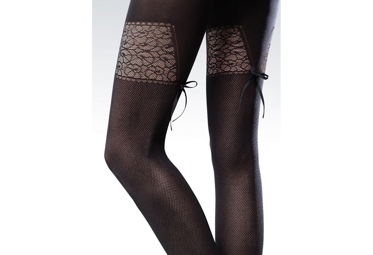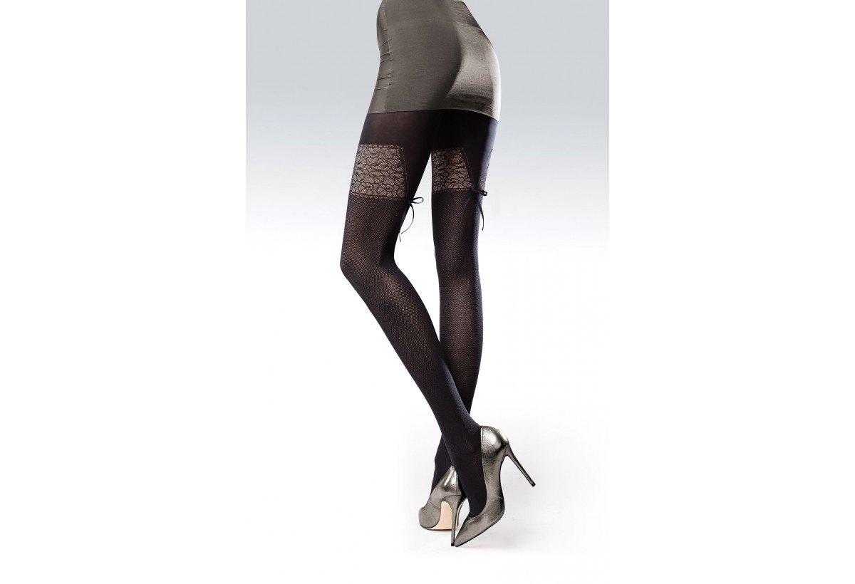 Czarne rajstopy z bordową kokardką - model Elle firmy Knittex - oryginalny wzór - kropeczki i imitacja koronki od pończoch z kokardką 50 den.
